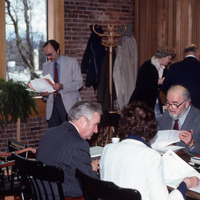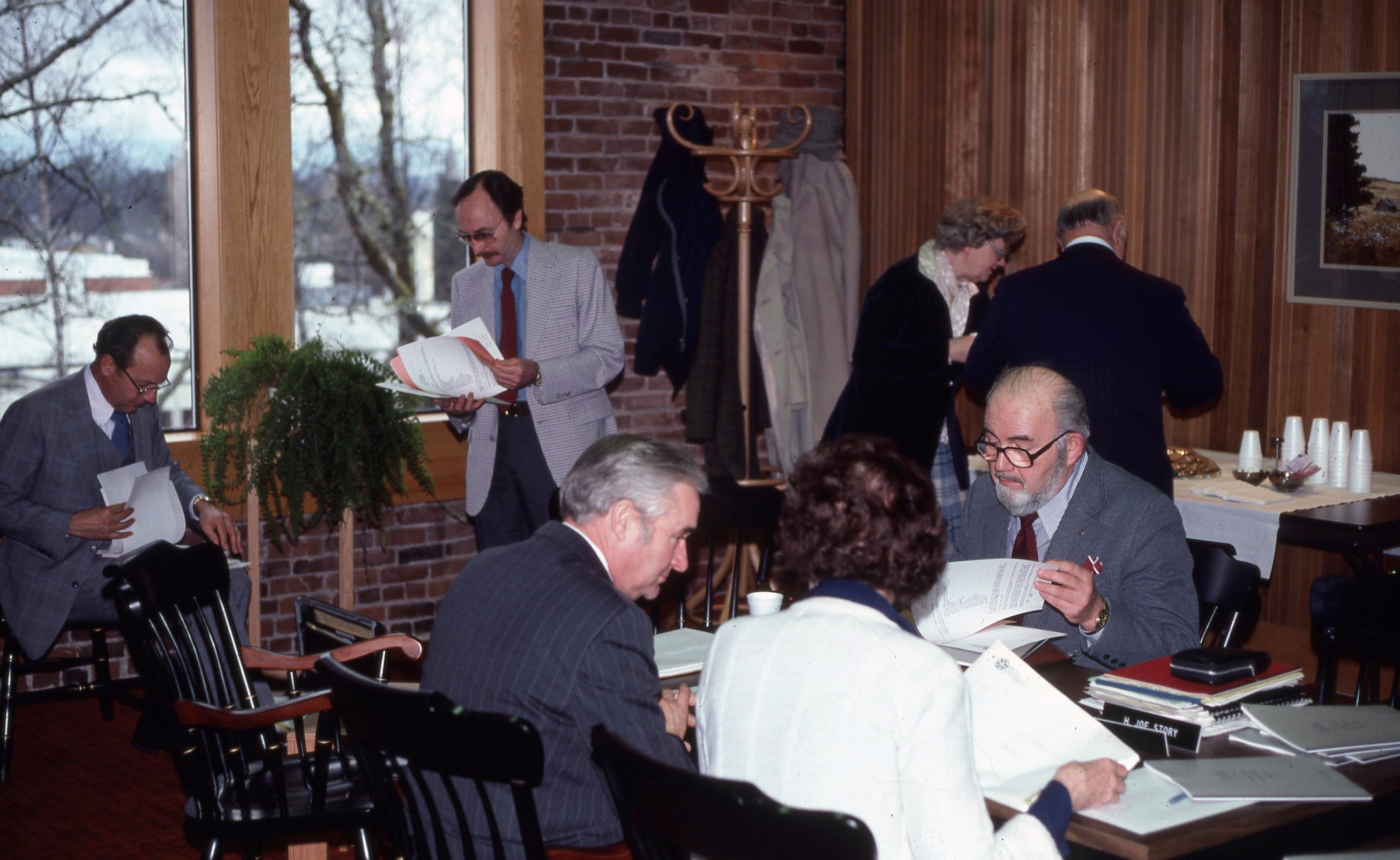 Members of Pacific University's Board of Trustees examining papers while at a Trustees' meeting on the third floor of Marsh Hall. The man standing in front of the window is Professor Joe Story, who taught Economics. The man with glasses on the right is Leland H. Johnson, Treasurer of the Board. This is one of a set of photographs that were all taken during the same meeting. The original slide was printed in March, 1979.
