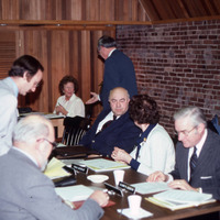 - Members of Pacific University's Board of Trustees examining papers while at a Trustees' meeting on the third floor of Marsh Hall. This is one of a set of photographs that were all taken during the same meeting. The original slide was printed in March, 1979.