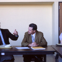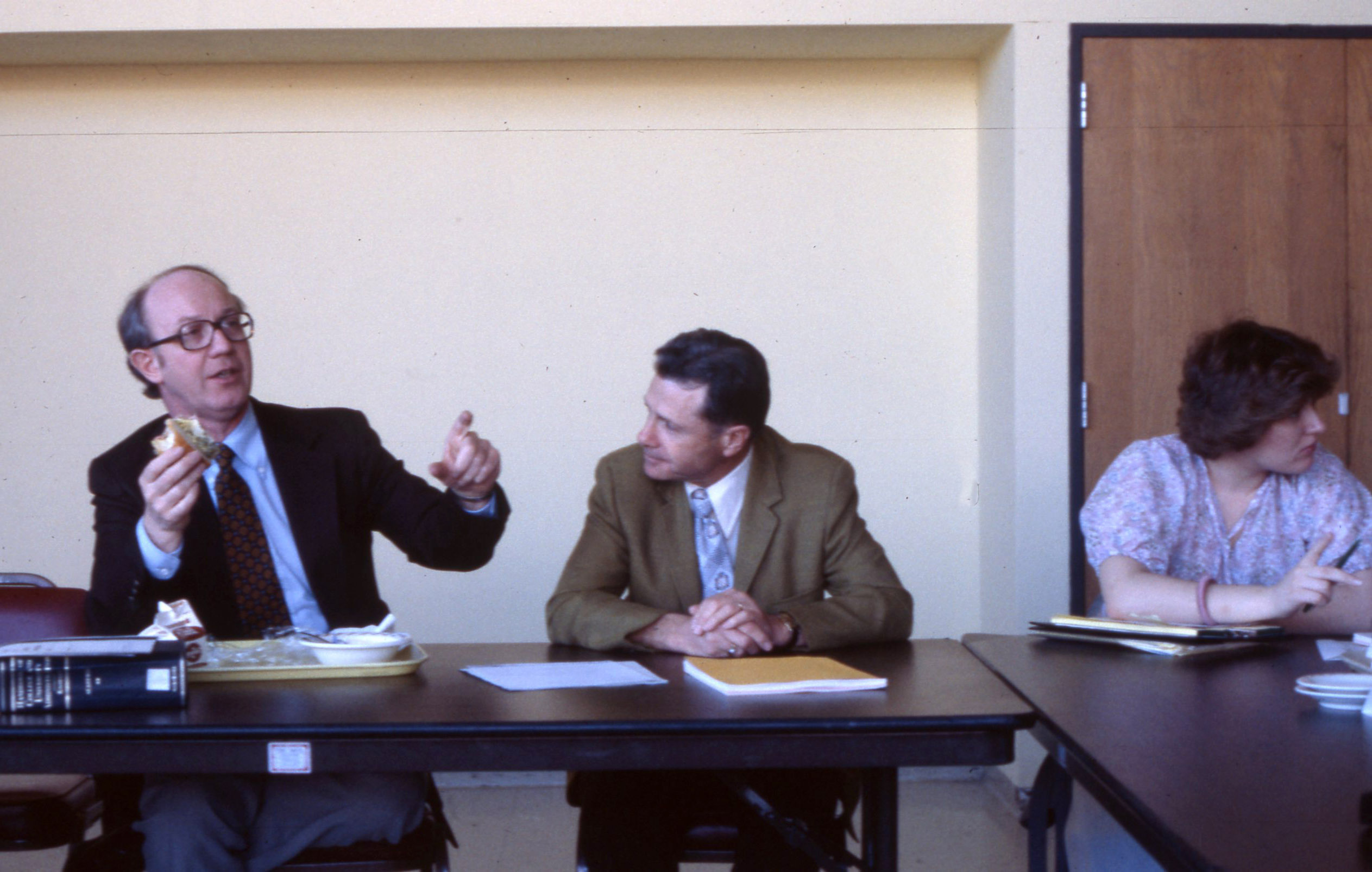 A Pacific University professor or administrator speaking during what appears to be a student-faculty meeting, held in Washburne Hall in March 1979. A tray from the cafeteria is in front of him. At that time, the university was in the midst of reforming its governance system; this meeting may have been held to discuss the issue. This is one of a set of several photographs taken at the same meeting.