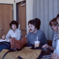 - Pacific University students and/or staff at a meeting held in Washburne Hall in March 1979. At that time, the university was in the midst of reforming its governance system; this meeting may have been held to discuss the issue (see The Index, Mar. 16, 1979). This is one of a set of several photographs taken at the same meeting.