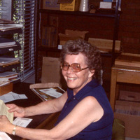 - A woman, probably library staff, at Pacific University. She appears to be performing clerical work, with correspondence, index cards, and several in-out boxes on her desk. Other boxes and office equipment are in the background. The original slide was printed in July, 1979.