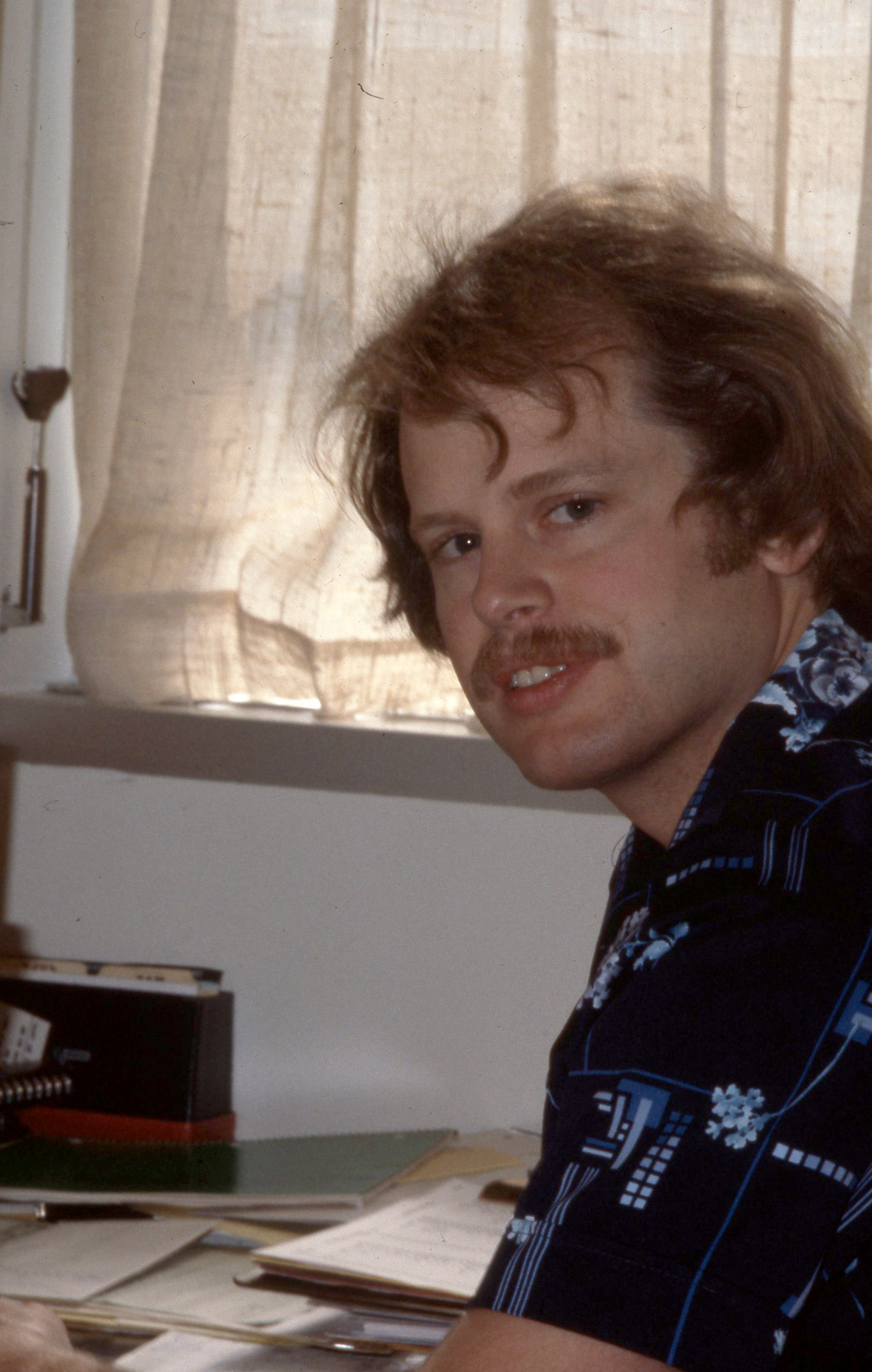 - A man, probably a Pacific University student but possibly staff, apparently studying with stacks of notes in front of him. This may have been taken in his Pacific University dormitory room: the window treatments appear to match those in other dorm photographs from this time period. The original slide was printed in September, 1979.