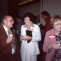 Pacific University alumni gathered at a reception, likely in Washburne Hall. The woman wearing a pink jacket is Louise Mitchell (Class of 1942), per her name tag. The name tag of the woman wearing white is only partially visible, but may be "McDowell". This was likely taken at the annual Alumni Reunion that took place on Homecoming weekend. The original slide was printed in October, 1979.