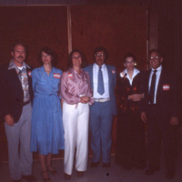 - A group of Pacific University alumni at a reception in October 1979. The original image was dark, and their name tags are not legible.