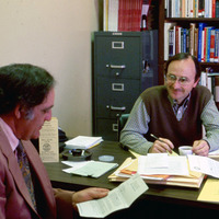 Professor Joe Story, who taught Economics at a Pacific University, in his office with a visitor who may have been another professor or an administrator. They appear to be discussing a letter that the visitor is holding in this hand. Books on economics and business topics are on the shelves in the background. This photograph was likely taken between 1977 and 1983.