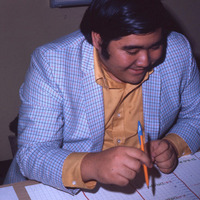 Harlan Takahashi, who was probably a student or faculty member at Pacific University, with what appears to be a chart with data: possibly an attendance sheet. Based on another photograph that appears to have been taken at the same time, he was likely working with a class led by Speech and Communications professor Albert "Hap" Hingston. This photograph was probably taken circa 1970-1973.