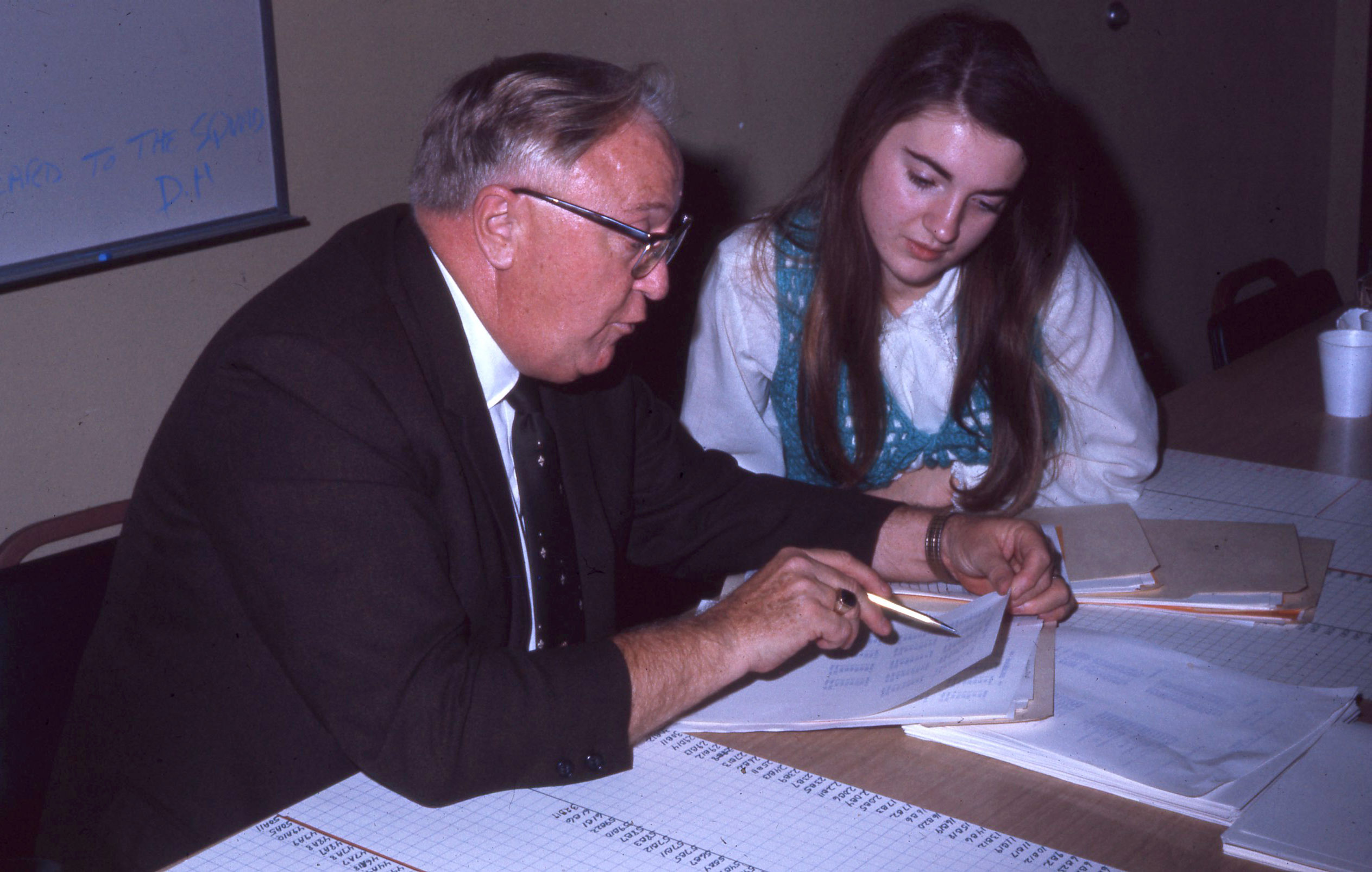 - Pacific University professor Albert "Hap" Hingston with student Val King (Class of 1973). Hingston taught speech and communications. They appear to be examining data collected on the papers that are spread out on the desk in front of them. This photograph was probably taken circa 1970-1973.