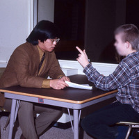 Pacific University student Leslie Higa (Class of 1971) interviewing a child, likely as part of a speech assessment or intervention. The child's face has been digitally blurred to protect his privacy. This is one of a small set of photographs which appear to show research on speech and/or speech interventions, overseen by Pacific University speech and communications Professor Arthur Wilcox. See images PUA_PeoSlides_409 through PUA_PeoSlides_413. These photographs were likely taken circa 1970-1971.