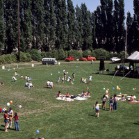 People waiting for the beginning of "Spring Fest," a live music event, on a football field in Forest Grove, Oregon in Spring, 1980. There is a stage in the background and an AV station in the foreground. In the middle ground, a mixed-age audience of children and adults have set up blankets and chairs on the grass, and have decorated with helium balloons. The event was described in the university's alumni magazine: "Lots of sunshine, frisbees, balloons, and music combined to make the third annual Spring Festival a day to remember. Two large tents were erected on the football field and Pacific students were able to picnic and sunbathe from 11 a.m. to 8 p.m. while listening to performers ranging from the Muddy Bottom Boys (bluegrass) to Ki-n-Kaboodle Clowns to Cruise Control (jazz)." (Summer 1980 issue, p. 5)