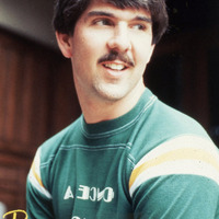 A portrait of Richard Albrecht, who was a student at Pacific University (Class of 1984) at the time this photograph was taken. Albrecht apparently signed the reverse side of the negative. His signature appears here facing in the correct direction, but the wording on his shirt is backwards. The image was likely made by a Pacific staff photographer for use in a campus publication. This slide was printed in September, 1983; but the photograph was taken earlier in that year. A photograph from the same time, but without the signature, was printed in August, 1983; see: PUA_PeoSlides_500. This other slide shows the full wording on his shirt, which reads: "Once a Viking..." This refers to the Forest Grove High School "Vikings," where he was a standout football player before coming to Pacific.