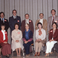 A group portrait of men and women who appear to be alumni of Pacific University; possibly accompanied by some faculty and staff. This is one of a set of group portraits that were taken in October 1980 during Homecoming and Reunion weekend. For a description of the event and other related images, see: Pacific University Alumni Magazine, Winter 1980-81 issue, p. 4.