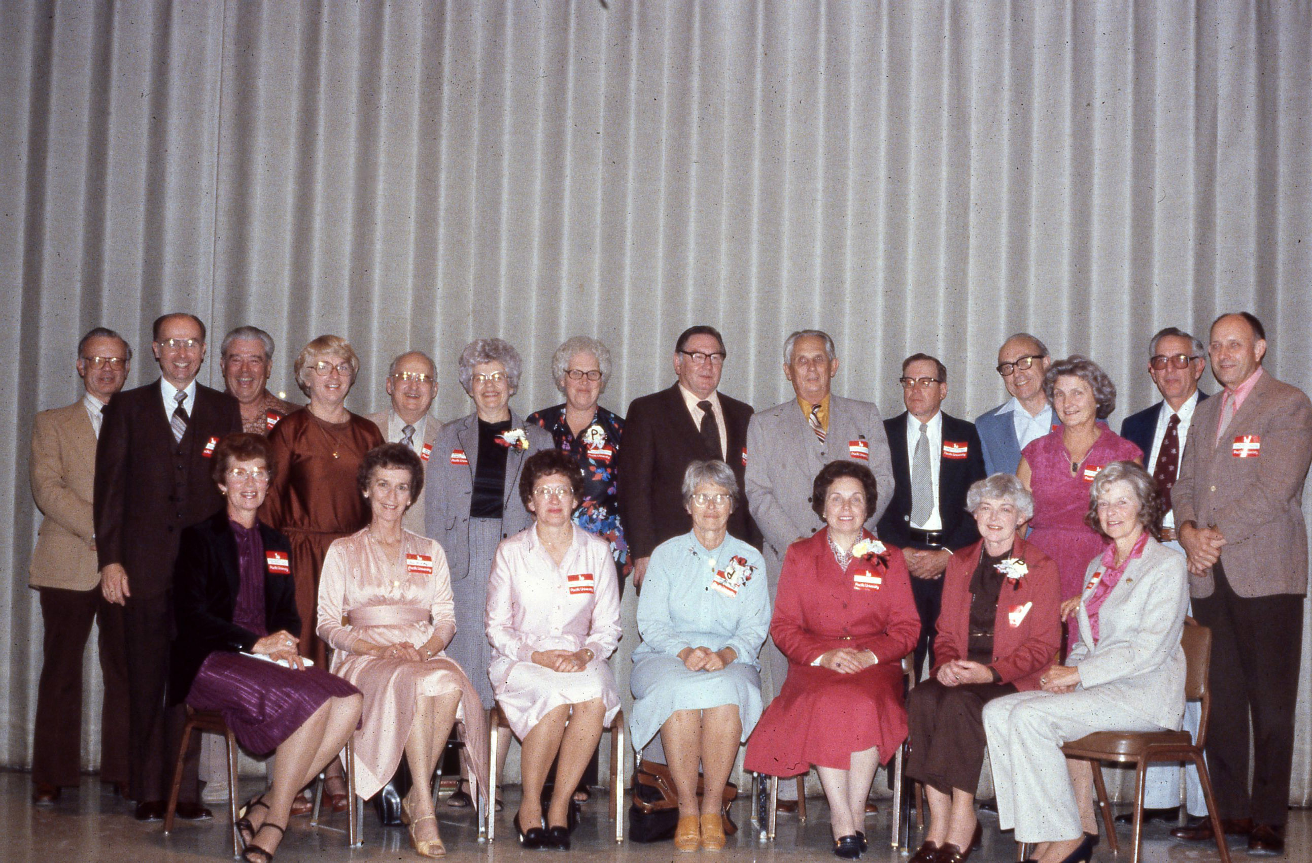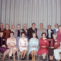 A group portrait of men and women who appear to be alumni of Pacific University; possibly accompanied by some faculty and staff. The woman in a grey suit with a large corsage, center-left, may be Alice E. Davis Hoskins (Class of 1956), who became the Service Center Manager at Pacific. The man with no tie, top row fourth from the right, appears to be Professor Fred Scheller (Class of 1943; 1953 MA). This is one of a set of group portraits that were taken in October 1980 during Homecoming and Reunion weekend. For a description of the event and other related images, see: Pacific University Alumni Magazine, Winter 1980-81 issue, p. 4.