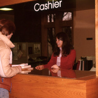 A student speaks to a staff member at the "Cashier" desk on the first floor of Marsh Hall at Pacific University. This was the desk where students settled tuition and other bills. The original slide, which has been color-corrected, was printed in February 1980. It is signed "J. Char," probably Jennifer Char Arashiro (Class of 1980); she was likely the photographer.