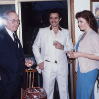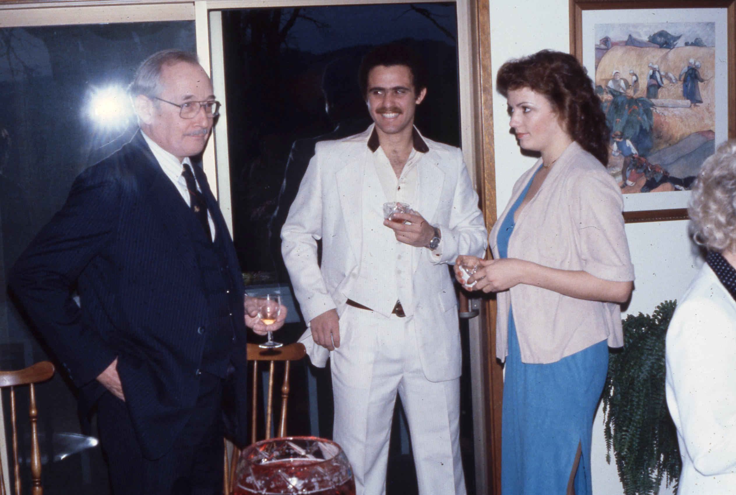 - Pacific University President James Miller (center) at a reception, with a man and a woman who might be alumni. The original slide was printed in February, 1980.