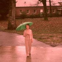 - A woman holding an umbrella walking on the Pacific University campus, with Warner Hall in the background. The original slide, which has been color-corrected, was printed in February 1980. It is signed "Jenni Char," probably Jennifer Char Arashiro (Class of 1980); she was likely the photographer.