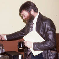 - A man wearing a tie and a leather jacket -- probably a Pacific University faculty member -- getting coffee from a set of carafes. The original slide was printed in March 1980. It is signed "Jenni Char," probably Jennifer Char Arashiro (Class of 1980); she was likely the photographer.