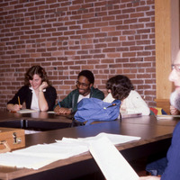 - Robert Davies (right), an English Professor at Pacific University, teaching several students in a classroom in Marsh Hall. The original slide was printed in March 1980. It is signed "Jenni Char," probably Jennifer Char Arashiro (Class of 1980); she was likely the photographer.