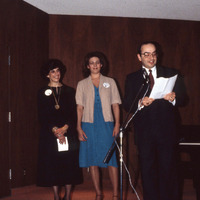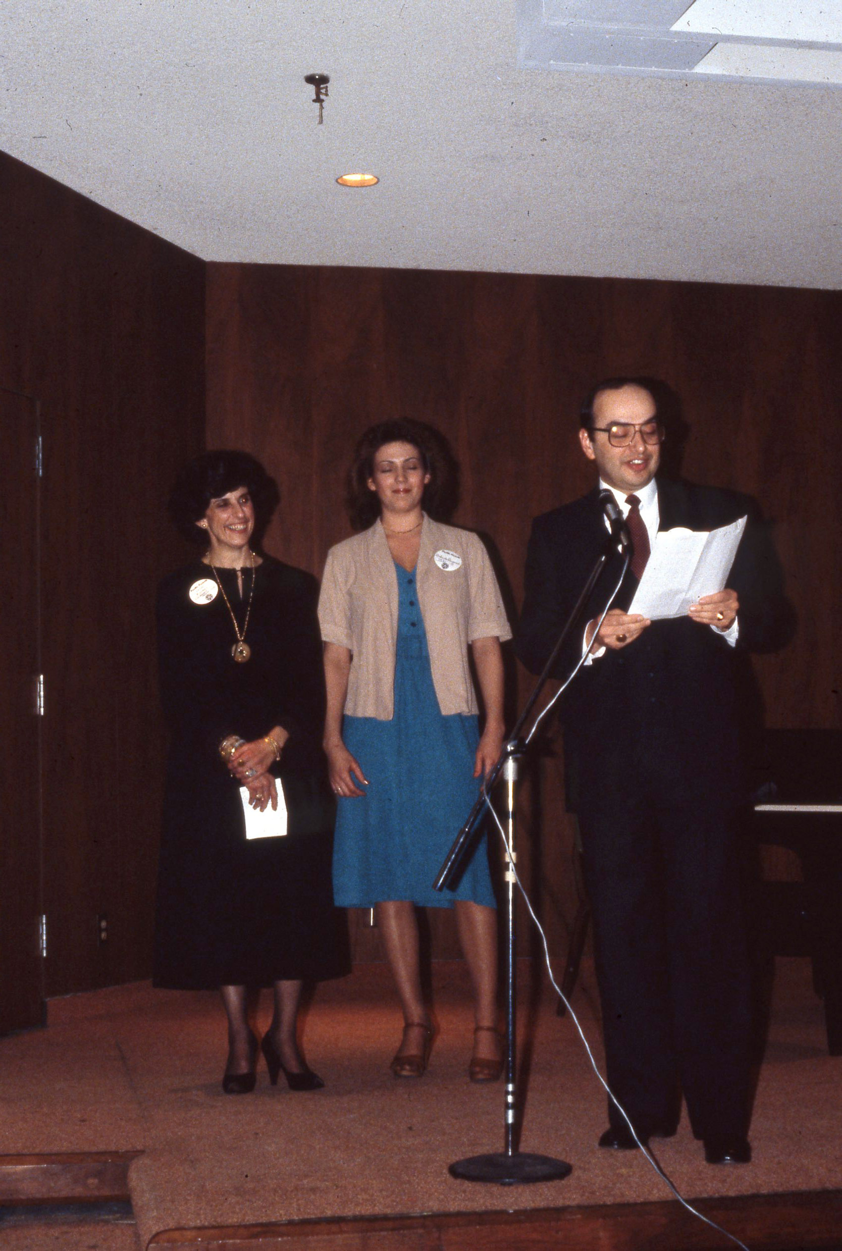 - A man standing on a small stage with a microphone, while two women stand behind him. They were likely staff or faculty at Pacific University. The original slide was printed in April 1980.