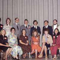 A group portrait of Pacific University alumni who graduated in the 1970s. This is one of a set of group portraits that were taken in October 1980 during Homecoming and Reunion weekend. This image was published in the Pacific University Alumni Magazine, Winter 1980-81 issue, p. 4. The caption for the published image provides their names as: Front row, from left: Margorie Hurst, Emily Rampton, Lyn Sites Beithan, Barbara Wedell, Sandy Lowe, Debbie Haller, Barbara Strain. Back row, from left: Claudell Combs, John Rodgers, Jess Gonnasen, Jeff Pratt, Steve Beithan, Steve Wedell, Warren Mitchell, Donald Higgins, Paul Haller, and Penny Stuve.