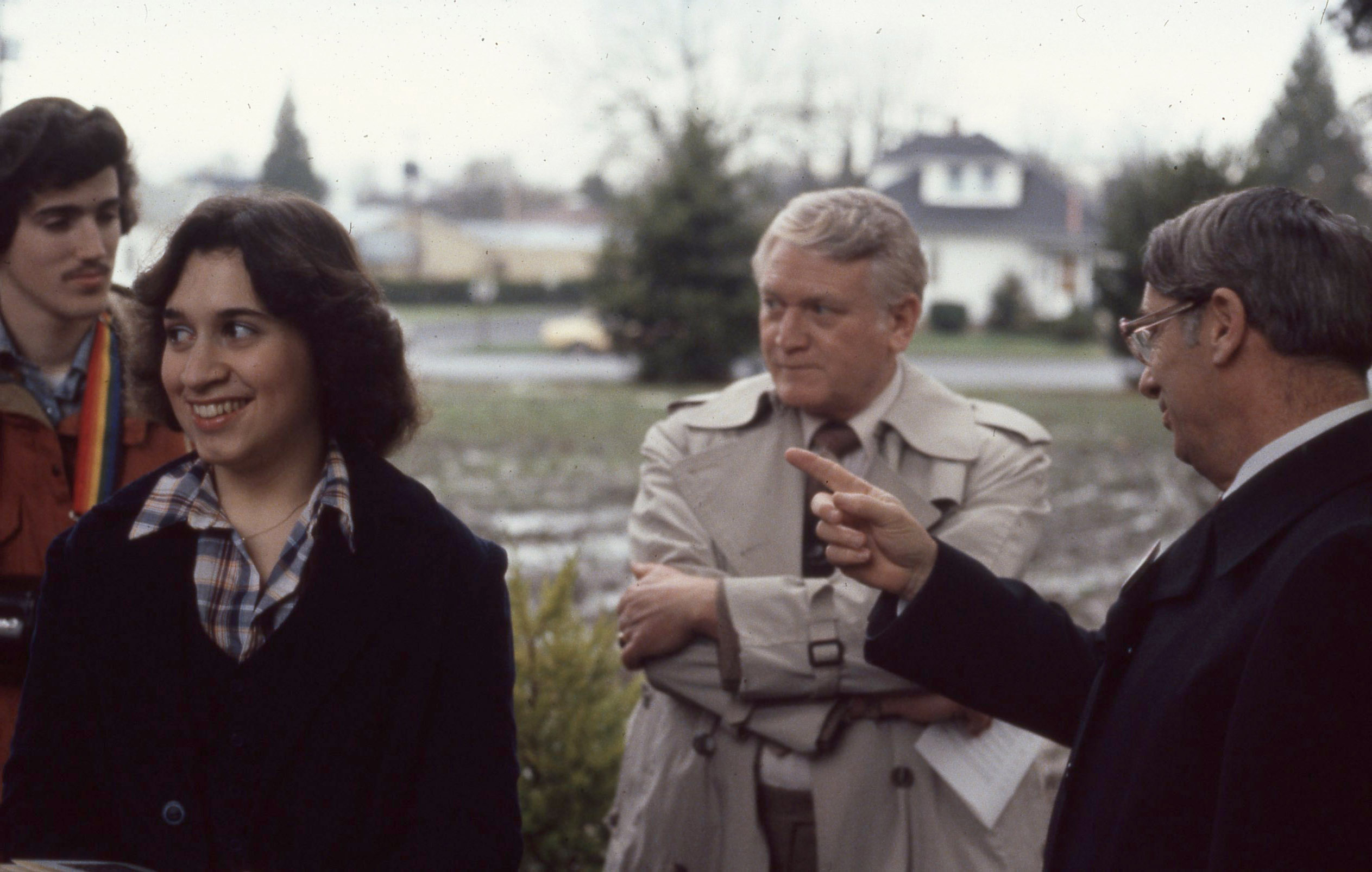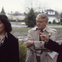 Attendees at the dedication of Pacific University's "Chemistry Unit of the Science Complex," later named Murdock Hall. The man who is pointing appears to be Pacific's President James Miller. The man in the background is identified in a photograph that was printed in the Pacific University Alumni Magazine as "Dr. Sam C. Smith ... of the M. J. Murdock Charitable Trust, which provided the matching grant the launched the campaign [to fund construction]" (Spring 1981 issue, p. 3). This event took place on January 22, 1981. According to the student newspaper: "The new chemistry unit features 24 person stations in two laboratories and 12 stations in another lab" (The Index, Jan. 16, 1981). This is one of a set of images taken at the dedication.