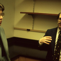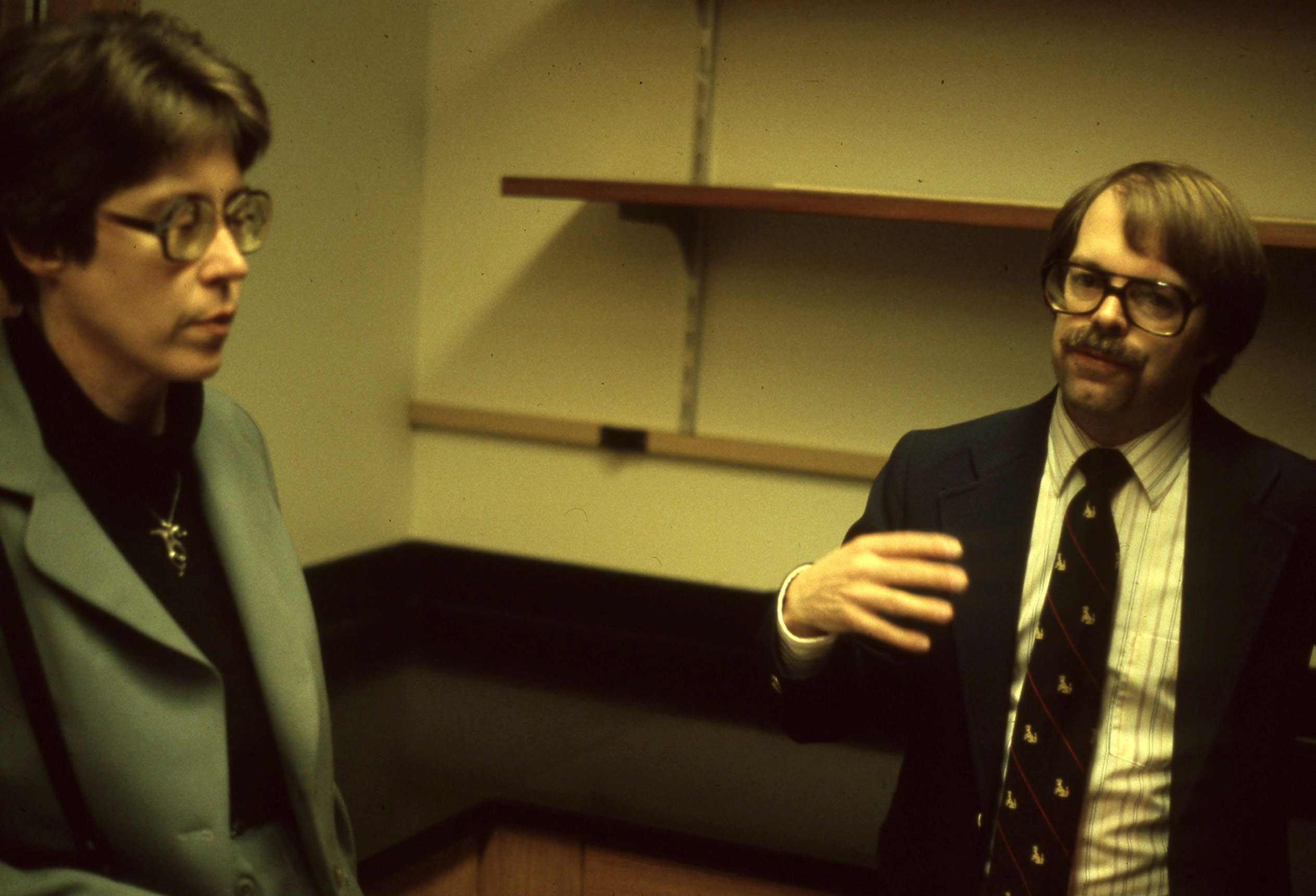 Chemistry Professor James O. Currie Jr. with another person during the dedication of Pacific University's "Chemistry Unit of the Science Complex," later named Murdock Hall. This event took place on January 22, 1981. Griffith was Chairman of Pacific's Division of Science and Mathematics at that time. According to the student newspaper: "The new chemistry unit features 24 person stations in two laboratories and 12 stations in another lab" (The Index, Jan. 16, 1981). This is one of a set of images taken at the dedication.