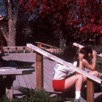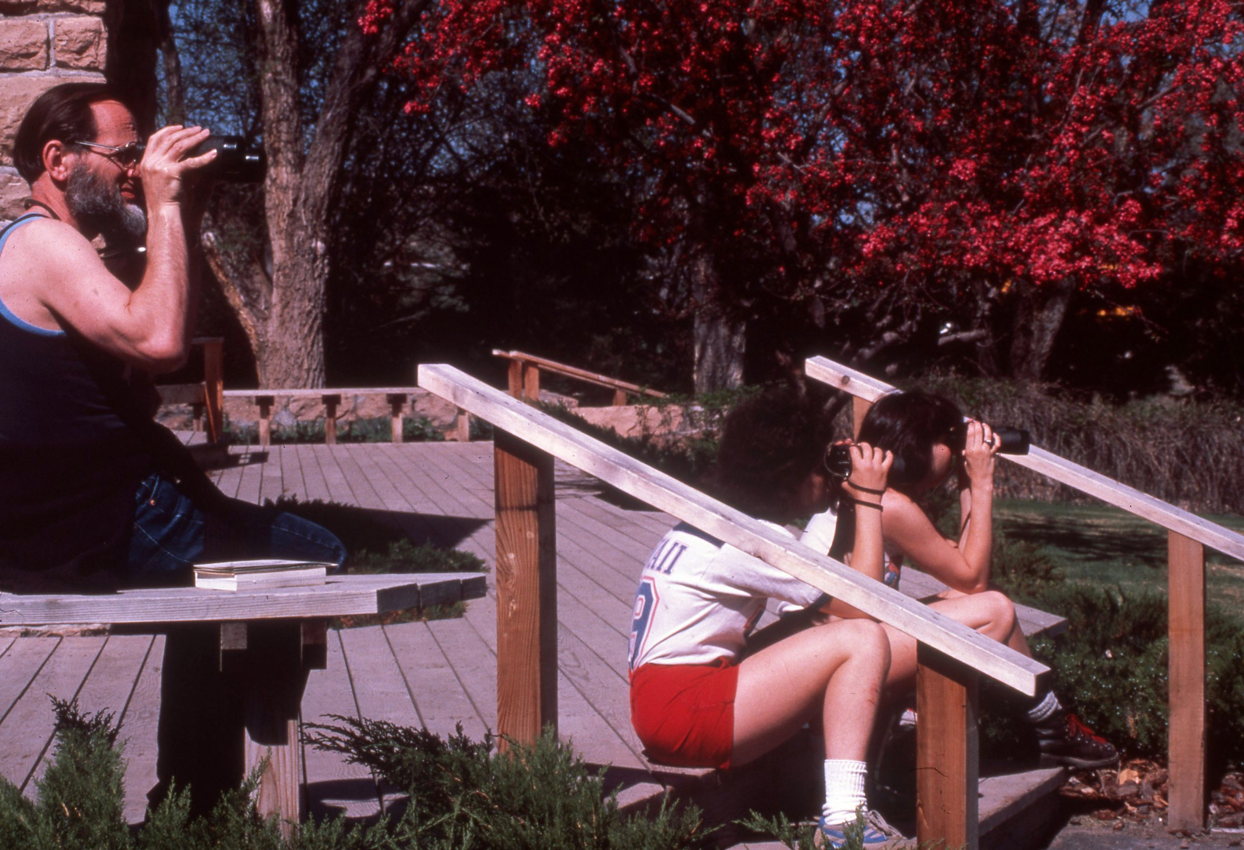Pacific University Professor Robert Davies, who taught English, using binoculars outdoors with several students. They appear to be birdwatching; possibly on a field trip. The original slide was printed in January, 1982, but appears to show a scene during the previous fall, possibly in October, 1981 based on the color of the trees' leaves.