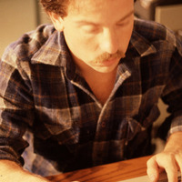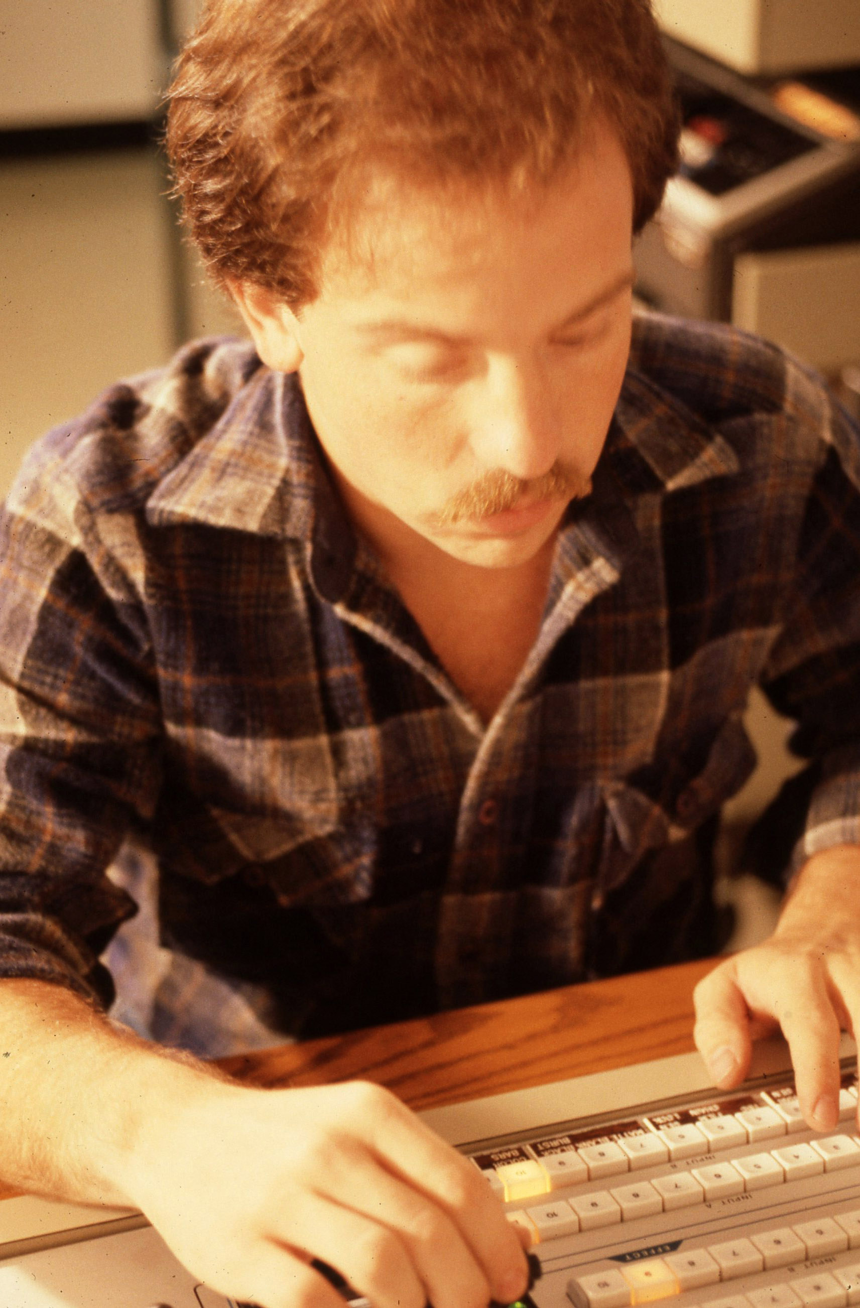A man, most likely a member of the Pacific University AV (audio-visual) unit's staff, operating what appears to be an AV control panel: most likely a video editing machine. At the time that this image was taken, Pacific was operating a public access cable broadcast studio; this may have been a part of it. On a related version of this slide, the man signed his own name as "David C. [Shimp?]"; his last name being only partially legible. This photograph was likely taken by a Pacific staff photographer for use in a campus publication. The original slide was printed in August, 1983. For two related images, see: PUA_PeoSlides_498 and PUA_PeoSlides_501