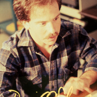 A man, most likely a member of the Pacific University AV (audio-visual) unit's staff, operating a keyboard. His signature was added to the slide. It appears to read "David C. [Shimp?]"; his last name being only partially legible. This photograph was likely taken by a Pacific staff photographer for use in a campus publication, and probably dates from August, 1983. For two related images, see: PUA_PeoSlides_499 and PUA_PeoSlides_499