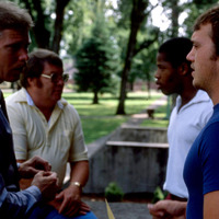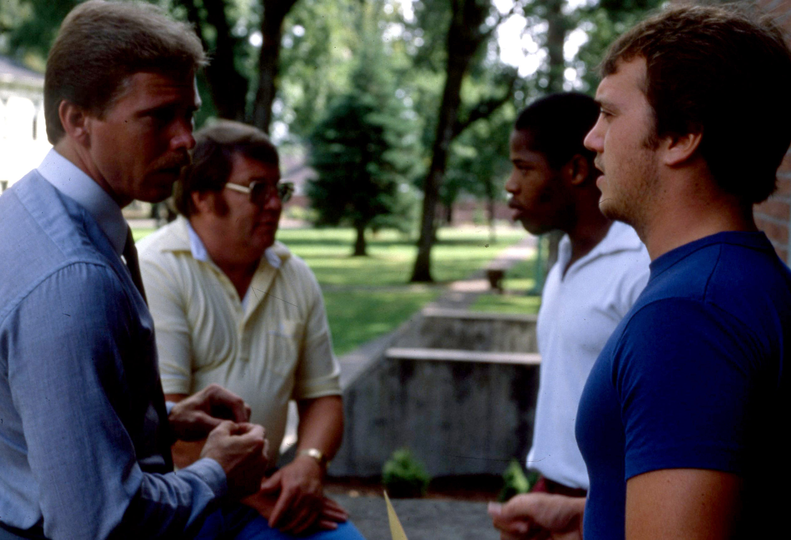 Two Pacific University students speaking with two older man, most likely professors or administrators. They are standing on the north steps of Marsh Hall; the camera is facing east towards Murdock Hall. This photograph was likely taken by a staff photographer, and probably dates from circa 1983-1985. For another view of the same group of people, see: PUA_PeoSlides_510