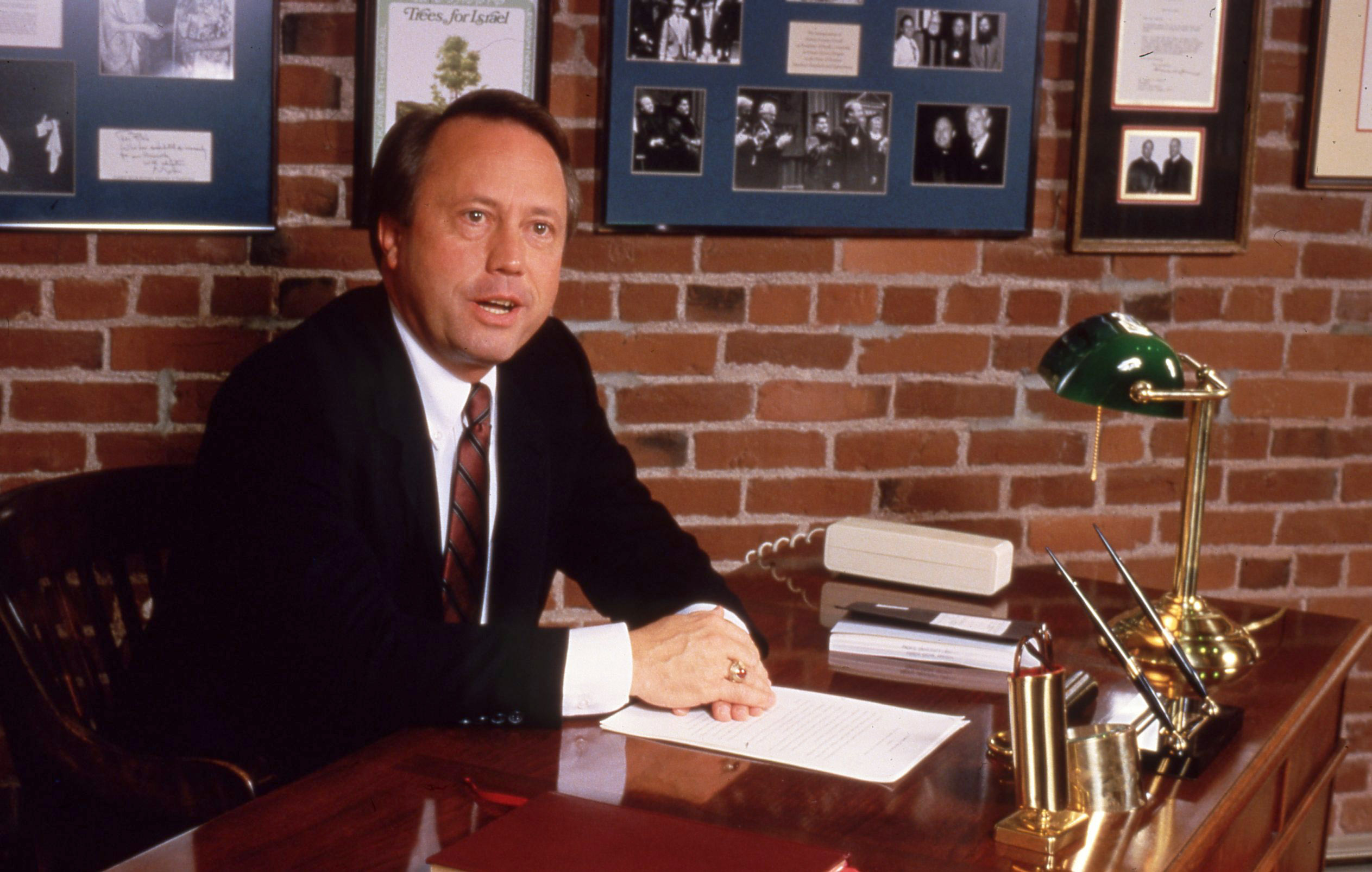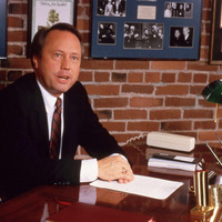 Robert F. Duvall, President of Pacific University, sitting at his desk in his office in Marsh Hall. A phone, papers, a lamp and other objects are on the desk; framed photographs are on the wall behind him. This photograph was likely taken by a Pacific staff photographer, probably sometime soon after Duvall's inauguration as University President, in late 1983 or in 1984. This is one of a small set of images from the same event.
