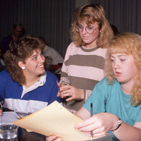 - Three Pacific University women students, performing what appears to be a physics or chemistry laboratory experiment using a scale. They appear to be discussing the results while taking notes. The original slide is dated October, 1988.