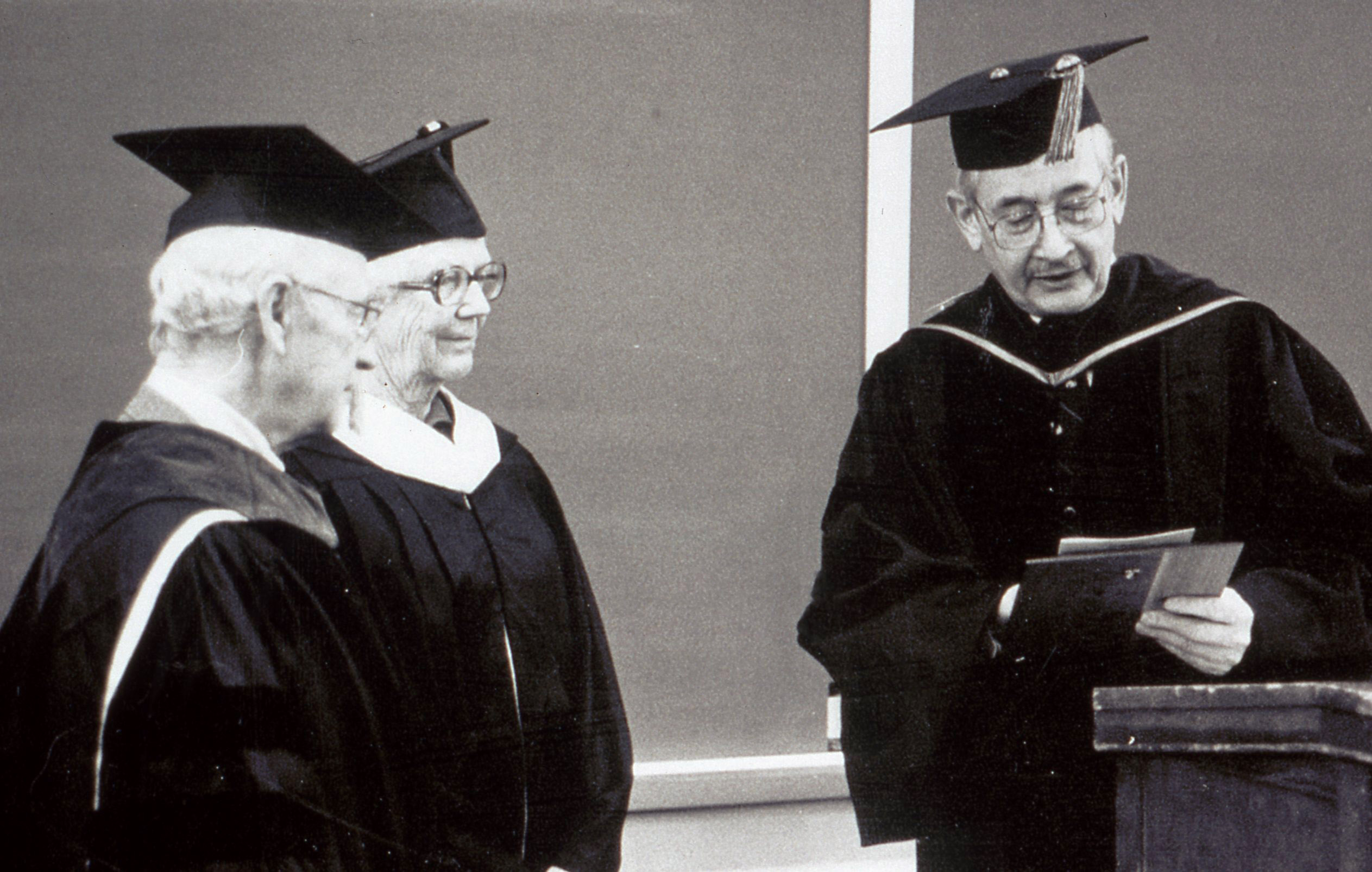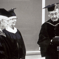 - Pacific University's President James Miller wearing academic regalia, standing at a podium with two older people who are also wearing academic regalia. He appears to be giving them an award, or possibly honorary degrees. This was likely taken during Commencement in the 1970s.