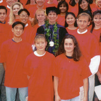 Pacific University's President Faith Gabelnick in full academic regalia, surrounded by Pacific University students all wearing red, during her Inauguration on September 24, 1995. Gabelnick was Pacific's first woman president, serving from 1995-2003. In this photograph, she is wearing the President's medal with the seal of the university, and what appears to be a maile-style lei (though it might be made with oak or laurel leaves); this may have been a nod to Pacific's Hawaiian student community, and/or to Pacific's traditions honoring the oaks on campus. They are standing on the steps of Marsh Hall. This image was used on the cover of Pacific's Alumni Magazine in the Fall 1995 issue.