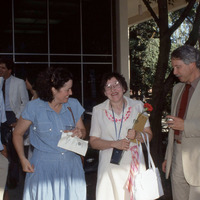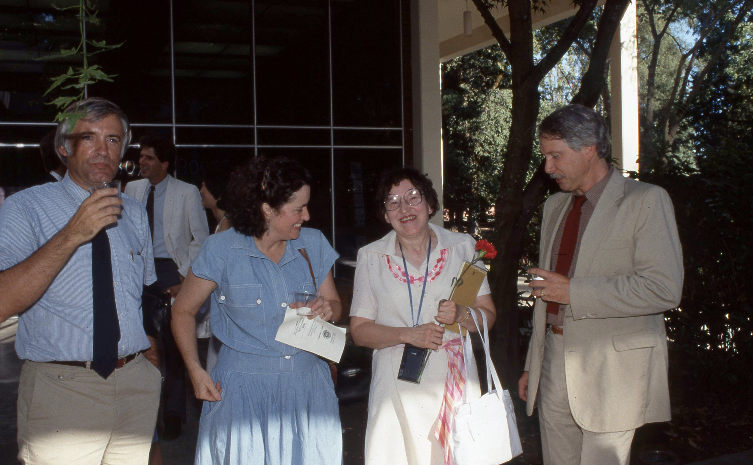 - A group of people attending a reception on the patio of Washburne Hall on the Pacific University campus, apparently following Convocation in Fall, 1986. One woman holds program from the Convocation ceremony; another woman holds a red carnation, possibly given to her during the ceremony.