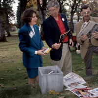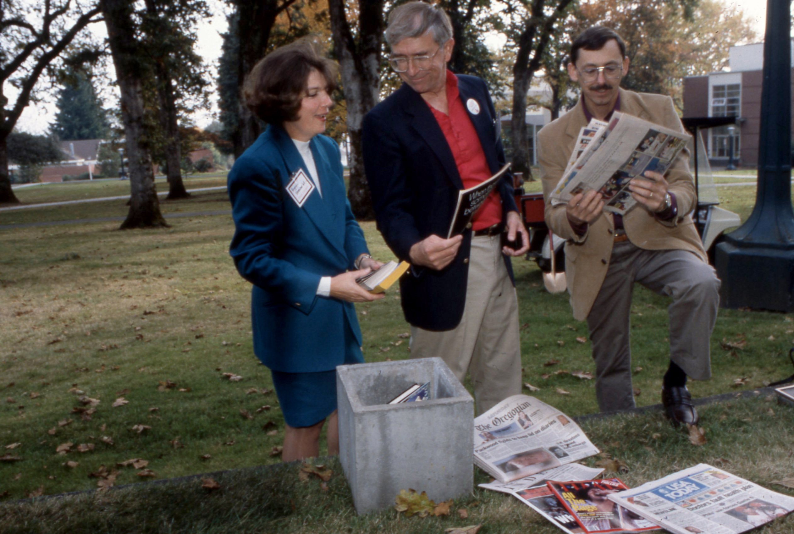 Alumni and/or staff of Pacific University, participating in the creation of a Time Capsule on October 23, 1993. They are placing copies of newspapers and magazines into a cement box. (For a related image taken at the same event, see PUA_PeoSlides_573.) This event was part of Pacific's 1993 Homecoming and Reunion. Two time capsule events were listed on the event schedule that year: this images relates either to the "0 year" time capsule, or the Class of 1968's 25-year capsule. It is unclear where the time capsule was to be placed. They are standing just east of Marsh Hall; Taylor-Meade Performing Arts Center appears directly behind them.