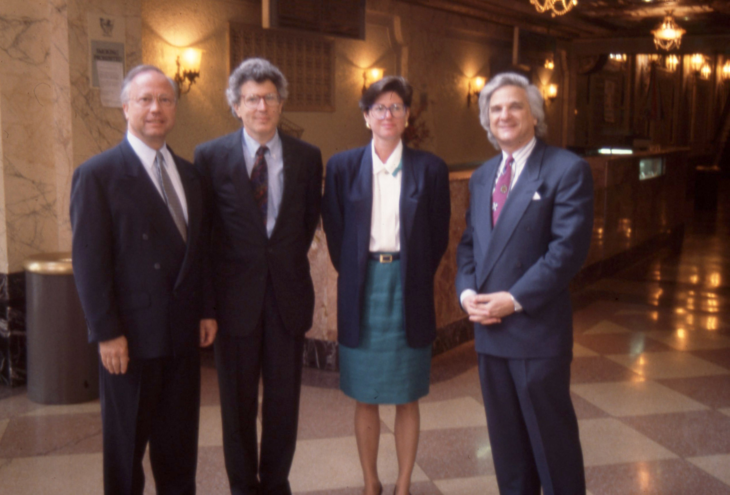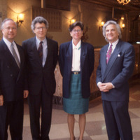 Pacific University's President Robert F. Duvall (left), with three other people who may be faculty or guests of the university, in 1994. They appear to be standing in the lobby of the Arlene Schnitzer Concert Hall. Very likely, this photograph was taken during the Tom McCall Forum, an annual political debate featuring prominent guest speakers which was hosted by Pacific University. The 1994 Tom McCall Forum was held on Feb. 27 at the Schnitzer. The debaters, John Sununu and Pierre Salinger, do not appear to be in this photograph.
