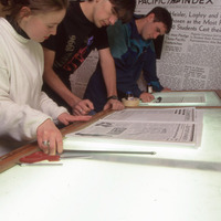 - Journalism students at Pacific University examining layouts for an issue of "The Index," Pacific's student newspaper. The original slide is marked "Phil Schofield Photo," most likely referring to the name of the photographer. It appears to date from circa 1996-1997.