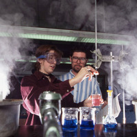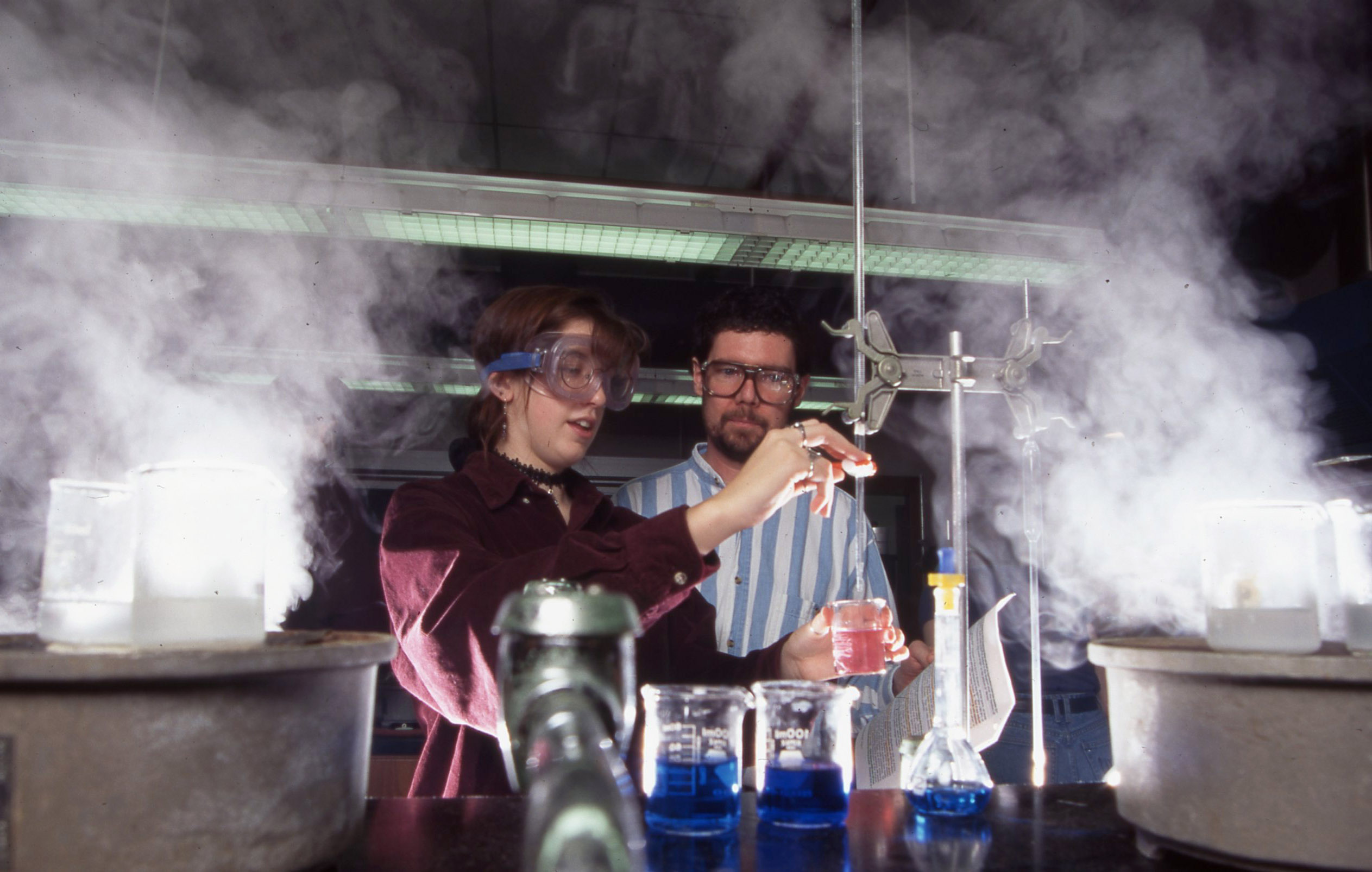 A Pacific University student with a man who was likely a chemistry professor, performing a chemistry laboratory experiment. The image was likely posed for dramatic effect, with clouds of vapor framing the two central characters against a dark background. The original slide is marked "Phil Schofield Photo," most likely referring to the name of the photographer, and is dated 1995. This photograph was published in Pacific's 1998 "Viewbook," which was sent as marketing material to prospective students.