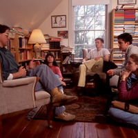 Pacific University Professor David Boersema, who taught philosophy, meeting with students in an office on campus. They appear to be on the second floor of Drake House, where the Philosophy Department was headquartered. This photograph was likely posed and intended to be used in marketing for the university. The original slide is marked "Phil Schofield Photo," most likely referring to the name of the photographer. It appears to date from the mid-1990s.