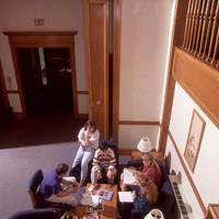 A group of Pacific University students studying in the lobby of the university's Carnegie Hall. The main entrance to the building is visible in the background. The original slide is marked "Phil Schofield Photo," most likely referring to the name of the photographer. It appears to date from the mid-1990s.