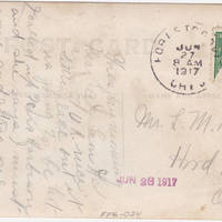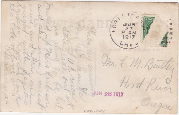 [front] 02 1st Ave. N. Looking Toward College Forest Grove, Ore. [back] [ink] Mr. L. M. Bentley Hood River Oregon Post marked Forest Grove Jun 27 1917 with a one cent stamp (partial) Stamped in red ink Jun 28 1917 Tuesday morning Dear Lee & Leni We arrived OK. Nice little place but it is going to be hot. I called up ?? Harbison and she says I must come and stay one night with her so I guess I will have to. Lots of love Hanna