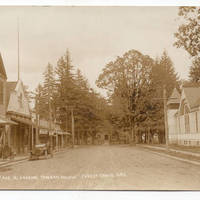 Picture taken from center of what was then called "North 1st Ave" (now renamed 21st Avenue), in Forest Grove, close to the intersection with Main Street, looking east towards Pacific University. On the left is a wood building with a sign on the side ICE CREAM In front of the store are two men and a boy. One man is leaning on a 4-wheeled cart on the sidewalk. There is a barber pole just behind these two men. Just a few feet down from these men is a right-hand steering open car with a man at the wheel. A building just beyond the car has a sign OREGON LAND COMPANY and next to it is THE BAZAAR then MILLINERY, BOOK STORE and CITY LIBRARY There is another man close to the Millinery sign. There is a two horse buggy parked at the end of the block by College Way. The street is packed dirt and the sidewalk and curb appear to be concrete. On the right is the wooden Congregational Church