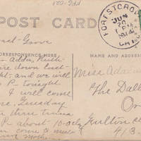 [front] No 4 Pacific Ave Looking East Forest Grove Ore. [back] Miss Adaleude Disbrow The Dalles Ore. Fulton St 413 Post mark Forest Grove Jun 20 1914 with a one cent stamp. Forest Grove Dear Addu Ruth- came down last night and we will go to P- tonight and I will come home. Tuesday on the three train leaves P- about 10-oclock. You can come to meet me your mother