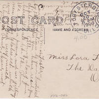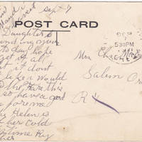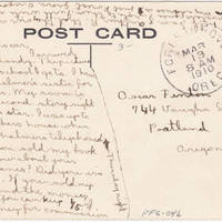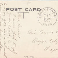 [b-side] [ink] Miss Lora Foster, The Dalles Ore. Postmarked Forest Grove Oct 20, 1908 with a one cent stamp. Dear Miss Foster, Congratulations to you. I noticed by the paper you have received your diploma. Getting along fine here We all like the Prin. We have a piano and are getting new maps globes ect. Which was needed very much. Alma or Paul have not entered yet. The school is crowded, won’t be room for many more. Hope you like your new position. Please send me a postal of your school. Elizabeth Swanson Have 48 in my grade. Hope you can read this, if not send for the ???. This was written several weeks ago but forgot to post it. [c-side] [ink] Miss Annie Ingers? Oregon City Oregon Postmarked Forest Grove May 3, 1909 with a one cent stamp. Dear Annie I was glad to get your card, and to hear you were all well. I am serving here and Amy is still in college. ?? ?? warm, dry and dusty here. Tell everyone I have not forgotten them at all – am very busy M. I. V. [d-side] [ink] Oscar Fenton 744 Vaughn St. Portland Oregon. Postmarked Forest Grove Mar 13 1910 with a one cent stamp [pencil] Wash. with a circle around it [ink] Dear Oscar. I arrived fine & dandy. The picture is the school I go to. I have Miss Chalmer’s sister for a teacher. My room is in the second story right under the star. I was up to my teachers house when Miss Chalmers telephoned Thursday night. Have you sold my book yet? How about your airoplanes? Did you win a price? If you sold my book send the money to me. You can keep ’15 of the money for commission. Tell Sam & Arthur R. that they owe me some postals cause I wrote to them. I will write soon. You write soon my address is just Forest Grove, Oregon Arthur M. [e-side] [ink] Mrs Chr McElroy Salem, Oreg Postmarked Forest Grove Sep 7 19?? With a one cent stamp Dear Daughter Im sending your skirt to day hope you get it all right it don’t look like I would get to the fare this yere so have a good time for me i hope Helen is rid of her cold by this time By Mother Do you hear from Mandi I havent