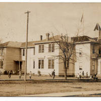 A large wood building with a steeple above the main entrance. Children are present in the side yard along with a few adults. There is a board sidewalk on each side of the street and the street is dirt and very rough. This was the first Central School. The land was purchased in 1876 and school started in 1895. The school was torn down and the new brick Central School was built in its place.