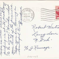 [front] Lincoln Grade School, Forest Grove, Ore. WA-13 [back] Robert Watrous Langdon N. Dak. c/o G. Ramage Postmarked Forest Grove Jun 17 1950 with a six cent Air Mail stamp. 6/16/50 Dear Robert: -Just in case you are homesick for L. S.? It surely is quiet around your place and about town as well. Strawberry picking is at its peak. Sorry to be away? Wonder what you think of the prairies. Hope you are having a wonderful time Grandma