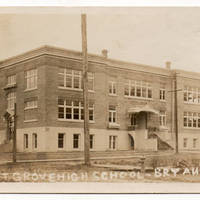 This brick three story building facing Elm Street was the first dedicated High School building and it was called South Park High School. There is a sidewalk in front and across the street, from where this picture was taken. This sidewalk looks to be boards and the street is packed dirt. There is also a fire hydrant on the same side of the street where the photographer took the picture. The main entrance is in the middle of the front of the building and there is an entrance on the left side, which can be seen in the photograph. There is are flower boxes at the two windows that are on each side of the entrance. A man is standing at the extreme left of the picture facing the camera. The building was sold to the Catholic Church and was being converted when it was destroyed by fire in 1956. The gymnasium, across Elm Street, was torn down in the mid 1980's.