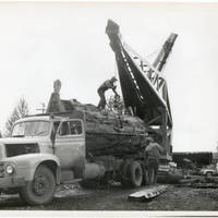 2 of 8 of a series of photographs showing a prototype boom unloading logs from a logging truck at Gales Peak Lumbermill. In this picture the boom is positioned over the logs on an International Harvester logging truck. A man is standing on the top log positioning the grappling hook to ready for unloading the log. Another man is removing the tiedown chains from the load. There is a 1953 or 1954 Ford pickup in the background. This boom, produced by Wallace Dozers in Forest Grove, became the “Heel Boom” known throughout the Northwest for its advantages over older style booms in loading and unloading logging trucks.
