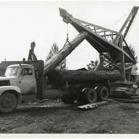 3 of 8 of a series of photographs showing a prototype boom unloading logs from a logging truck at Gales Peak Lumbermill. In this picture the boom is positioned over the logs on an International Harvester logging truck. A log is being removed from the truck. This picture demonstrates how the underside of the boom can control the log and keep it from swinging. This boom, produced by Wallace Dozers in Forest Grove, became the “Heel Boom” known throughout the Northwest for its advantages over older style booms in loading and unloading logging trucks.