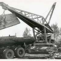 4 of 8 of a series of photographs showing a prototype boom unloading logs from a logging truck at Gales Peak Lumbermill. This picture is a close up of the underside of the boom showing how it can control the log and keep it from swinging. This boom, produced by Wallace Dozers in Forest Grove, became the “Heel Boom” known throughout the Northwest for its advantages over older style booms in loading and unloading logging trucks.